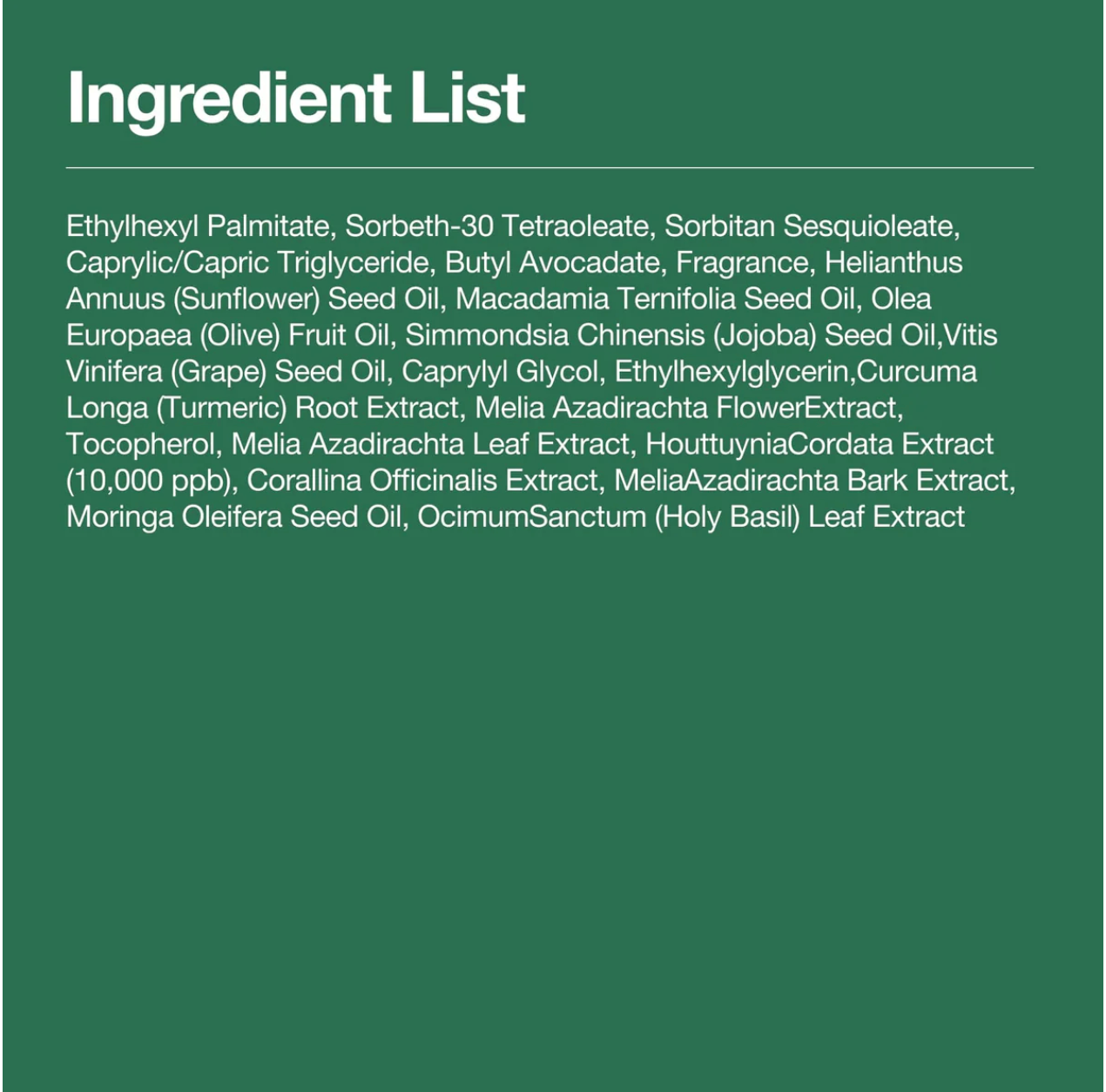 Ethylhexyl Palmitate, Sorbeth-30 Tetraoleate, Sorbitan Sesquioleate, Caprylic/Capric Triglyceride, Butyl Avocadate, Fragrance, Helianthus Annuus (Sunflower) Seed Oil, Macadamia Ternifolia Seed Oil, Olea Europaea (Olive) Fruit Oil, Simmondsia Chinensis (Jojoba) Seed Oil, Vitis Vinifera (Grape) Seed Oil, Caprylyl Glycol, Ethylhexylglycerin, Curcuma Longa (Turmeric) Root Extract, Melia Azadirachta Flower Extract, Tocopherol, Melia Azadirachta Leaf Extract, Houttuynia Cordata Extract, Corallina Officinalis Extract, Melia Azadirachta Bark Extract, Moringa Oleifera Seed Oil, Ocimum Sanctum Leaf Extract